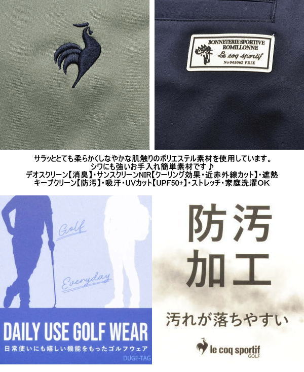 【2026年春夏新商品】 ルコックゴルフ ゴルフウェア メンズ ジョガーパンツ スウェットパンツ イージーパンツ パンツ LG6SLP55M スタイリッシュなシルエットとシンプルなデザインで汎用性が高いジョガーパンツ ■ スタイリッシュな見た目と履き心地の良さを両立させた、ゴルフにも日常にも使いやすいシンプルデザイン ■ ウエストゴムで、前開きなしのプルオンタイプ。ウエストはスピンドル入りで調整可能。 ■ 左後ろのトリコロールテープと右後ろのアーカイブワッペンが、さりげなくフランスらしい遊び心を演出します。 【KEEP CLEAN】汚れが落ちやすく、きれいな状態が長持ちする加工 【DEO SCREEN】気になるニオイの原因である4大臭(汗臭:アンモニア・イソ吉草酸・酢酸、加齢臭:ノネナール)を大幅に減少させます。50回の洗濯後でも効果が持続する耐久消臭。 【DAILY USE GOLF WEAR】日常使いにも嬉しい機能性をもたせ、シンプルながらさり気ないディテールや素材にこだわった、ゴルフウェアの幅を広げるルコックスポルティフの定番シリーズです。 ■シルエット:9分丈のジョガーシルエット ■素材:二重織で適度なハリ感のあるストレッチ素材 サラッととても柔らかくしなやかな肌触りの素材を使用しています。 春から初夏くらいがオススメ着用シーズンです。 秋もオススメです。 |