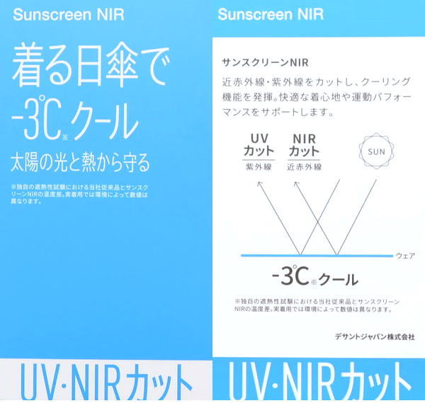 | 特 徴 | 天竺無地織柄入り サンスクリーンNIR(クーリング効果・近赤外線カット) 遮熱 吸汗速乾 UVカット(UPF50+) ストレッチ 家庭洗濯可 |