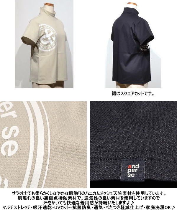 【春夏商品】 アンパシー andperse レディース ゴルフウェア 半袖ポロシャツ 半袖シャツ AFS9516V2 (M/L/LL) アンパスィのSWING DRYメッシュ半袖モックネックシャツです。 右胸に入ったプリントがポイントで、アンパシーらしいデザインの半袖ポロシャツです。 衿元にプリント、左袖口にロゴ入り織ネームが付いています。 細かいところも丁寧に作りこまれていますので、『あっ、良い感じ♪』と思っていただけましたら超オススメですよ♪ 生地にサラッととても柔らかくしなやかな肌触りのハニカムメッシュ天竺素材を使用しています。 肌離れの良い裏側点接触素材で、通気性の良い素材を使用していますので 汗をかいても快適な着用感が持続いたしますよ♪ 吸汗速乾・UVカット・抗菌防臭加工の高機能素材を使用しています。 肌触りの良い素材で、マルチストレッチいたしますので着心地も抜群ですよ♪ 家庭洗濯できます。 ![]() ![]() ![]() ![]() ![]() ![]() |
