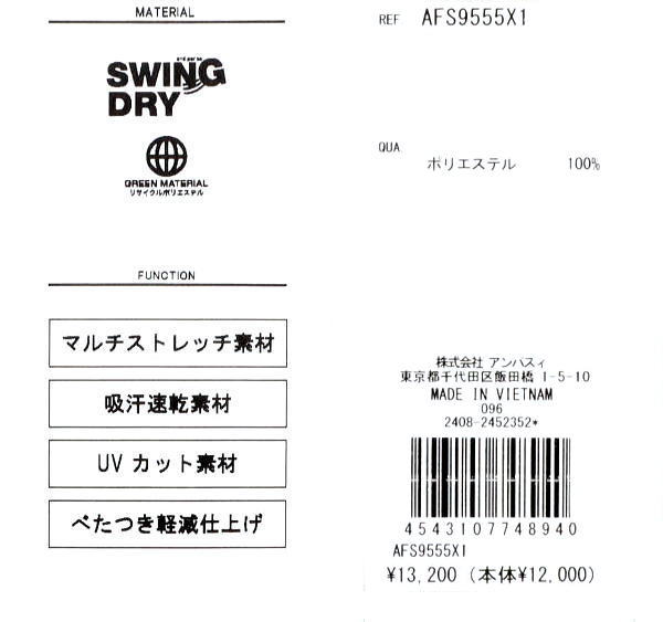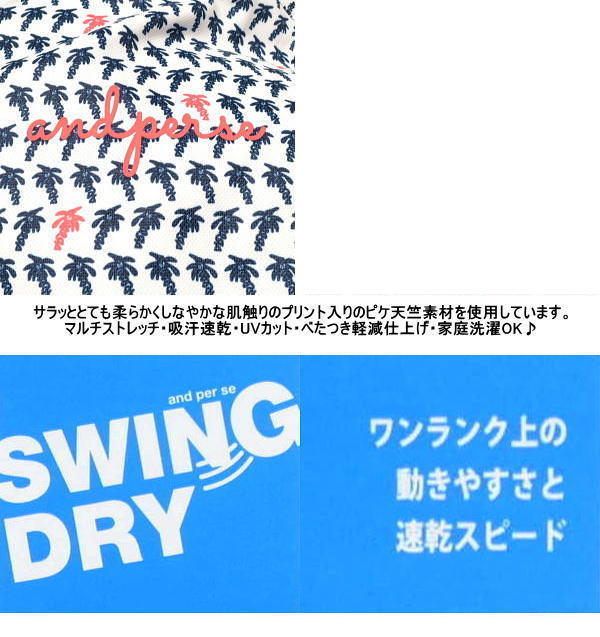 | 特 徴 | ピケ天竺プリント SWING DRY(ワンランク上の動きやすさと速乾スピード) 吸汗速乾 UVケア マルチストレッチ べたつき軽減仕上げ 家庭洗濯可 |