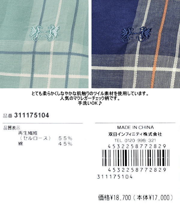 | 特 徴 | ツイル マックレガーチェック柄 手洗い可 |