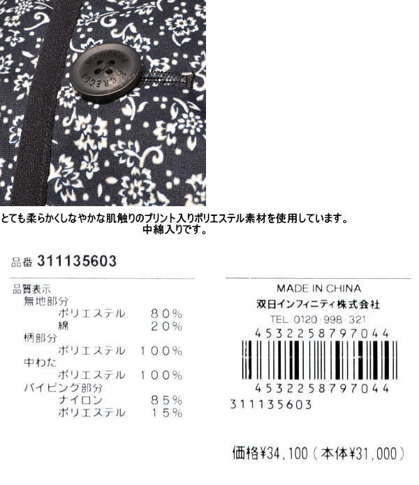 特 徴 | 無地:ポリエステル/綿ツイル 柄:ポリエステルプリント リバーシブル 中綿入り ドライクリーニング |