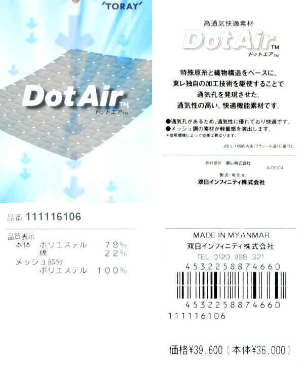 | 特 徴 | ドットエア使用(高通気・軽量) 手洗い可 |