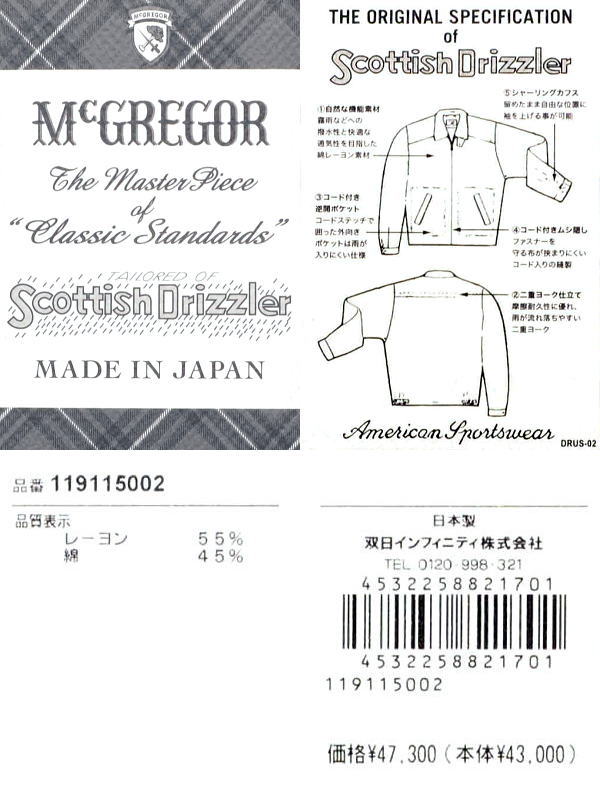 マクレガー ドリズラー メンズ 119115002 手洗い可 日本製 ドリズラージャケット ブルゾン ジャケット ジャンバー McGREGOR |