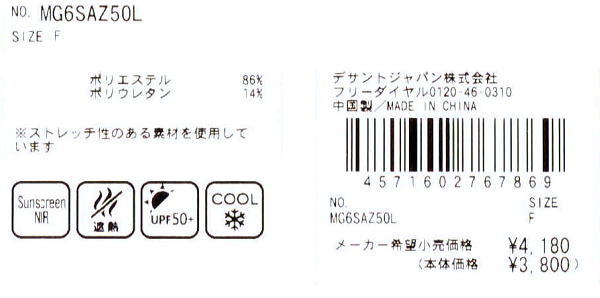 | 特 徴 | サンスクリーンNIR(クーリング効果・遮熱・近赤外線カット) UVカット【UPF50+】 ストレッチ 手洗い可 全長:約41cm |