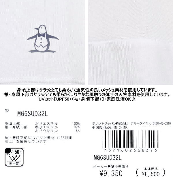 | 素 材 | 天竺(袖・身頃下部) メッシュ素材(身頃上部) UVケア(UPF50+/袖・身頃下部) 家庭洗濯可 |