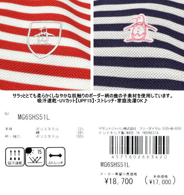 【2026年春夏新商品】 マンシング MUNSINGWEAR 万星威 먼싱웨어 ゴルフウェア レディース 半袖ポロシャツ 半袖シャツ MG6SHS51L (M/L/LL/3L) マンシングのマナード先染めボーダー飛びプリント半袖シャツです。 人気のボーダー柄の生地を使用したマンシングウエアの半袖シャツです。 前身頃に入った飛び柄プリントが良い感じですよ♪ 細かいところも丁寧に作りこまれていますので、『あっ、良い感じ♪』と思っていただけましたら超オススメです。 生地はサラッととても柔らかくしなやかな肌触りのボーダー柄の鹿の子素材を使用しています。 吸汗速乾・UVケア素材ですので、汗をかいても快適な着用感が持続いたしますよ♪ 肌触りがよく、ストレッチいたしますので着心地も抜群です。 家庭洗濯できます。 大きいサイズ・キングサイズ・ビッグサイズ・クイーンサイズの3Lあります。 ![]() ![]() ![]() ![]() |