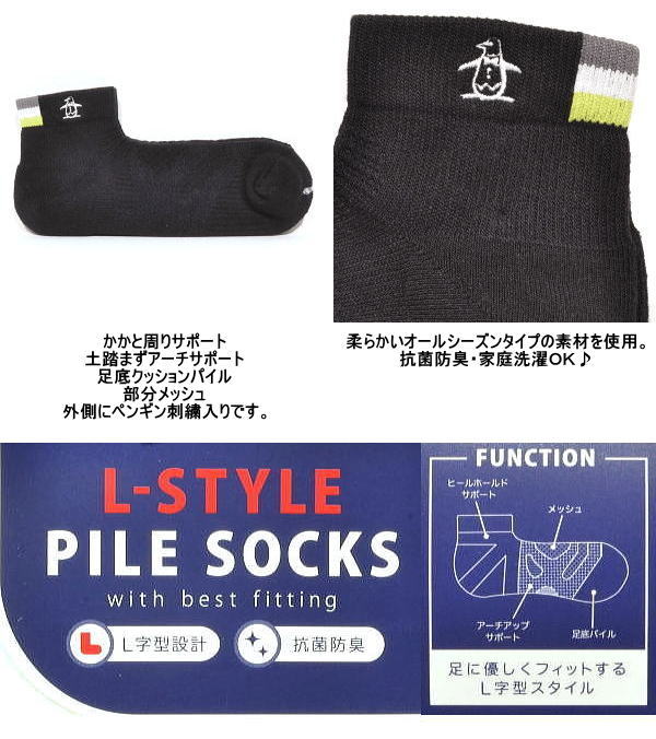 | 特 徴 | 25~27cm ショート丈 抗菌防臭 かかと周りサポート 土踏まずアーチサポート 足底クッションパイル 部分メッシュ 家庭洗濯可 |