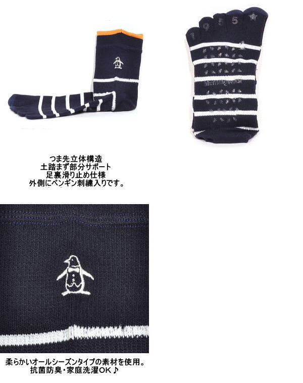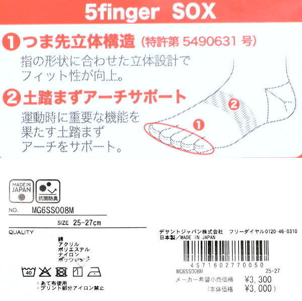 | 特 徴 | 25〜27cm ショート丈 抗菌防臭 指先立体構造(特許) 土踏まずサポート Yヒール 足底滑り止めプリント 家庭洗濯可 日本製 |