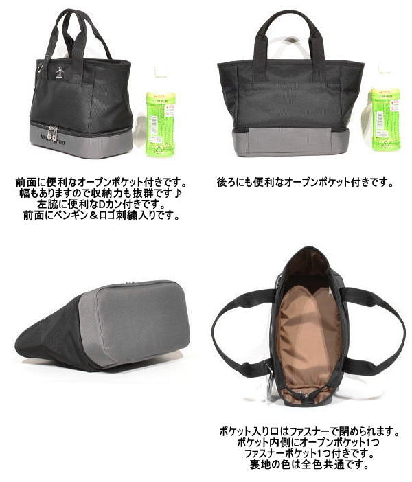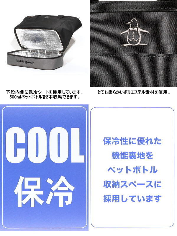 | 素 材 | 保冷機能裏地使用 500mlペットボトル2本収納可 ヨコ:約25cm(底部/上部の高さは36cm)×タテ:22cm×幅:14cm 持ち手を含めた高さ:約35cm |