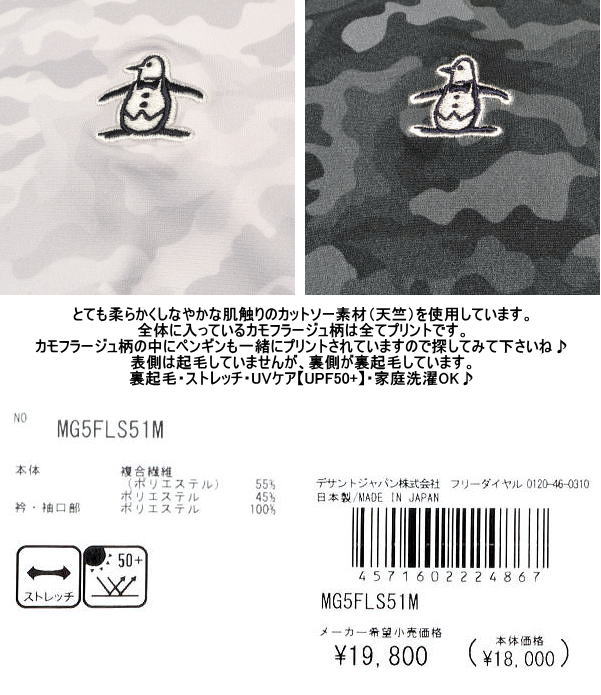 【2025年秋冬新商品】 マンシング MUNSINGWEAR 万星威 먼싱웨어 ゴルフウェア メンズ 長袖ポロシャツ 長袖シャツ MG5FLS51M (M/L/LL/3L) マンシングウエアのストレッチペンギンカモフラージュプリント長袖ポロシャツです。 全体に入ったカモフラージュプリントが良い感じのマンシングウェアの長袖ポロシャツです。 カモフラージュの中にペンギンも一緒にプリントされていますので探してみて下さいね♪ 細かいところも丁寧に作りこまれていますので、『おっ、良い感じ♪』と思っていただけましたら超オススメです。 生地はとても柔らかくしなやかな肌触りのプリント入りカットソー素材(天竺)を使用しています。 表側は起毛はしていませんが、裏側が裏起毛しています。 肌触りがよく、ストレッチ・UVカット素材ですので着心地も抜群ですよ♪ 秋から冬がオススメ着用シーズンです。 家庭洗濯できます。 大きいサイズ・キングサイズ・ビッグサイズ・クイーンサイズの3Lあります。 ![]() ![]() ![]() |