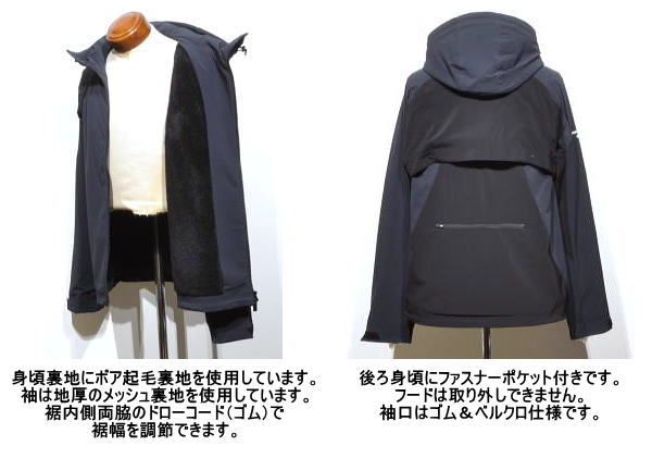 | 特 徴 | 表地:ナイロン85% ポリウレタン15% 別布(脇・ベスト肩):ナイロン89% ポリウレタン11% 裏地:ポリエステル100% ストレッチ ボア起毛裏地使用 家庭洗濯可 中国製 |
