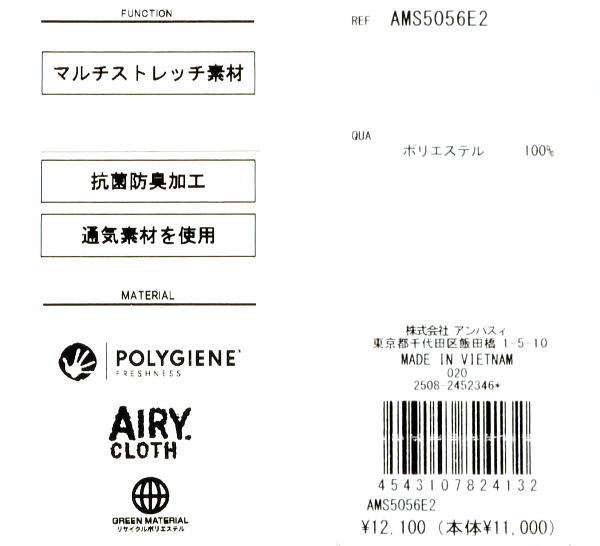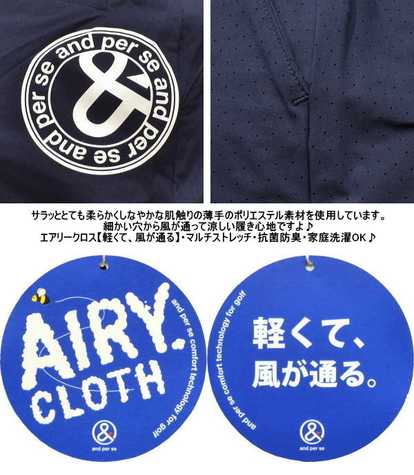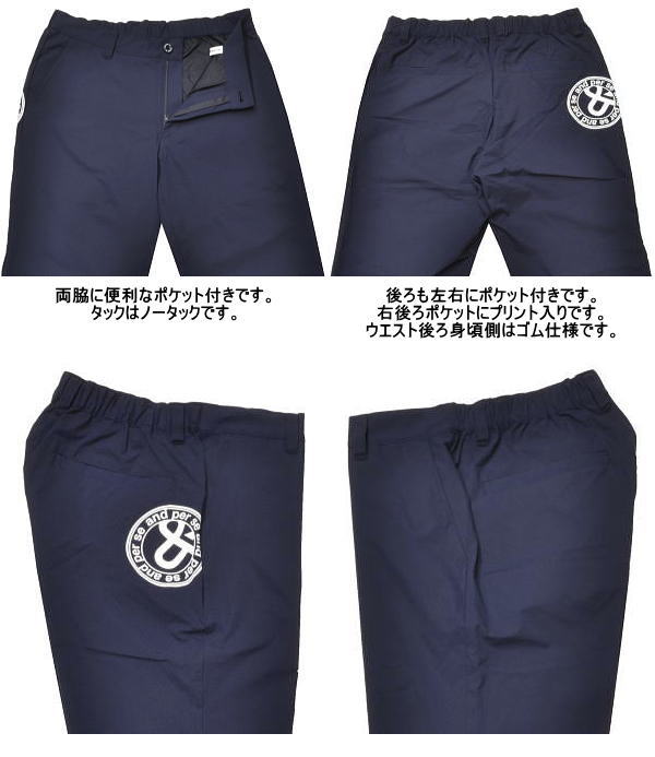 | 特 徴 | AIRY CLOTH(軽くて風が通る) マルチストレッチ 抗菌防臭 通気 ウエストゴム仕様 家庭洗濯可 |