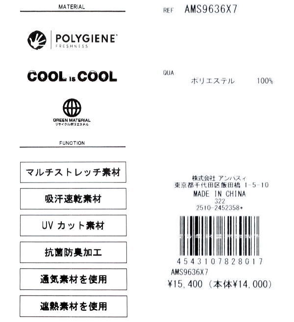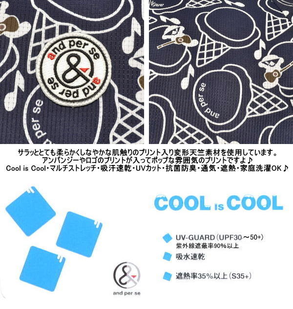 | 特 徴 | 変形天竺プリント Cool is Cool マルチストレッチ 吸汗速乾 UVケア 抗菌防臭 通気 遮熱 家庭洗濯可 |