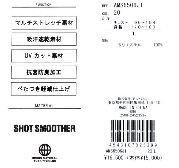 | 特 徴 | ショットスムーサー 天竺 マルチストレッチ 吸汗速乾 UVカット 抗菌防臭 ベタつき軽減仕上げ 家庭洗濯可 |
